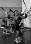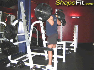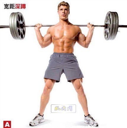 1.准备姿势:抬头挺胸直腰挺背;肩胛收缩后,将横杠放在隆起的斜方肌和三角肌上,可垫上海绵、毛巾等缓冲物;两手臂侧抬双手握杠起稳定作用;两脚间距一般同肩宽,两脚应呈30至45度角的自然站位;脚跟下垫一厚约3厘米杠铃片。 2.下蹲:做好准备姿势后,深吸气的同时慢慢屈膝控制下蹲,下蹲时膝关节的方向同脚尖的方向,蹲至大腿平行于地面或稍低于膝。 3.保持静止:下蹲至最低要保持1-2秒,然后再蹲起。肌肉被拉长后有明显的时间效应,时间越长肌力下降越多。因此停顿2秒蹲起的重量要偏小,但下肢肌群的实际受力并未减小,且相对要安全些。 4.蹲起:深蹲锻炼价值最大的是蹲起阶段,此阶段注意力集中在腿部用力,同时呼气;头要抬起,想象蹬腿用力使头能向上顶,而不要先抬起臀部后直腰;整个蹲起过程要保持重心稳定,脚不能移动;身体直立后,股四头继续用力,极度收缩,使膝关节保持过伸的趋向1-2秒。 注意事项: 1.动作过程控制杠铃稳定,不要盲目加重,否则容易出现低头、含胸、弓腰等,杠铃重心偏前在腰背上,容易受伤和驼背,而腿部锻炼效果减弱。 2.应同步加强腰背肌群力量,否则会限制腿部肌肉的增强;此外自我保护也很重要,最好有举重腰带,练习时请别人“把腰”和“托杠”保护。 3.站立时膝关节最好保持微屈,目的是让大腿保持持续张力,使更多的肌纤维参与工作,并可减轻膝关节受力,防止膝关节损伤。若因踝关节僵硬,或鞋跟偏致使重心向前,可适当把脚后跟抬高或下垫杠铃片。因肩部负重后,重心后移,而背部不能前倾,只有脚跟垫高,使重心被动前移,才能还原成稳定的支撑状态,重新获得的平衡还能使股四头肌在深蹲时受力增加。 4.掌握下蹲的深度:下蹲过深,在负重大的情况下,易导致受伤。当然膝盖健康的人采用全蹲能更深刺激股四头肌则应注意选择合适重量。 5.改变双脚的间距和角度可以给整个动作提供不同程度的刺激: (1)较宽的站位主要锻炼大腿内侧,可使你蹲得更低,腰腹力量要求高;较窄的站位主要锻炼大腿外侧,但给膝盖压力大些。 (2)脚尖朝外主要刺激大腿内侧;脚尖朝内主要刺激大腿外侧。