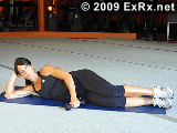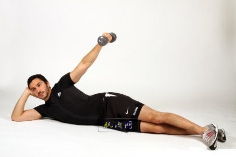 1.预备姿势:侧卧垫上,右手持铃,左手屈臂撑垫。最好的方法是使用上斜板或腹肌板,与地面成30度角,身体的左侧贴靠在上斜板上,右手抓握一只哑铃放在大腿右侧上,哑铃的重量应稍轻于站姿侧平举。 2.吸气,右臂直臂上抬至最高点。右臂稍弯曲,用半圆弧度举起哑铃过肩避免借力完成动作。