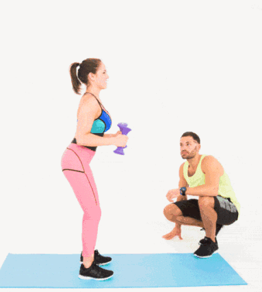 我们先让自己双手抓住哑铃,然后进行深蹲训练。