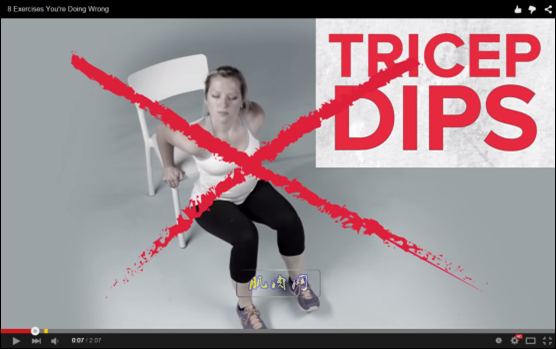 运动的好处非常多,它可以强化心肺功能、促进新陈代谢、预防多数疾病,还能使人心情愉悦。大部份的人在运动前都有事先锻练和暖身的良好观念让身体作好事前准备,但你可曾注意过你的伸展及锻炼是否在做白工? 日常锻炼的目的在于强化肌力,但错误的姿势可能会带来更严重的伤害!尤其是对运动新手而言,因本身肌力不够强健,身体会不自觉得像借助其它部位的外力来帮助动作完成,进而导致受伤。下篇文章主要介绍7项常见的锻炼运动,提供自我检视的机会。 1.三头肌支撑: 训炼三头肌与核心肌群的运动,同时也是想要挥别蝴蝶袖的女性的最佳选择。 错误示范