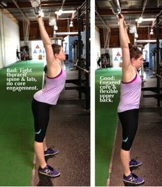 同时!站姿的过顶推举也是一个很好的诊断工具,如果你有虚弱的下背这时就会被诊断出来。当身体试图要保护下背避免受伤,就会降低神经冲动进到主要工作肌群,因此在过头的推举动作就会出现动作缺损。