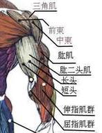 (一)前群 前群包括浅层的肱二头肌和深层的喙肱肌。 1.肱二头肌biceps brachil 呈梭形,起端有二个头,长头以长腱起自肩胛骨盂上结节,通过肩关节囊,经结节间沟下降;短头在内侧,起自肩胛骨喙突。两头在臂的下部合并成一个肌腹,并以一个腱止于尺骨粗隆。作用:屈肘关节;当前臂处于旋前位时,能使其旋后。此外,还能协助屈上臂。 2.喙肱肌coracobrachialis比较弱小,在肱二头肌短头的后内方,并与短头共同起自肩胛骨喙突,止于肢骨中部的内侧。作用:协助上臂前屈和内收。 3.脑肌brachialis位于肢二头肌下半部的深面,起自肱骨下半的前面,止于尺骨粗隆。作用:屈肘关节。 (二)后群 肱三头肌triceps brachii起端有三个头,长头以长腱起自肩胛骨盂下结节,向下行经大、小圆肌之间;外侧头起自肱骨后面林神经沟的外上方的骨面;内侧头起自挠神经沟以下的骨面。向下肱三头肌的三个头会合以一个坚韧的腱止于尺骨鹰嘴。作用:伸肘关节。长头尚可使上臂后伸和内收。