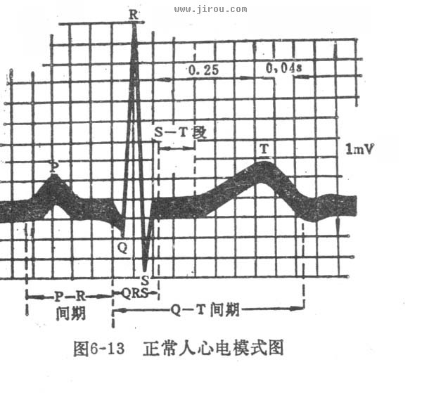 摘记心电图时,引导电极在体表安放的位置及其导线联接方式称为导联。从不同导联上捞记出来的心电图各有特点,图6—13是模式化了的心电图。心电图上各波、段的意义如下: