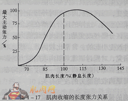 (1)、前负荷:前负荷是指在肌肉收缩前就加在肌肉上的负荷,它使肌肉收缩前就处于某种被拉长状态。前负荷 ,初长度 改变前负荷实际上是改变肌肉收缩的初长度。 (2)、肌肉收缩的长度-张力曲线 如果在坐标图上将肌肉在不同前负荷作用下长度与张力的变化绘制下来,就可以得到一条曲线,该曲线称为肌肉收缩的长度-张力曲线(图1-17)。该曲线类似开口向下的抛物线,其顶点显示适宜初长度时,肌肉收缩产生的张力最大。 (3)、长度与张力关系