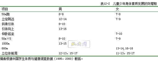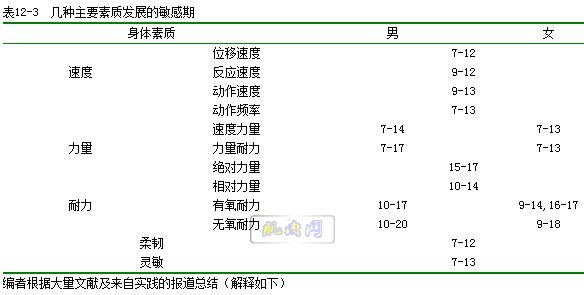 在身体素质发育的过程中,有一段时间某项素质发育速度特别快,人们称这段时间为该项身体素质的突增期。所谓突增期,是以年增长值的均值加上一个标准差(X+S)作为临界值,将年增长值大于或等于临界值的年龄阶段称为突增期。且随着追踪性研究的人群不同,有时根据具体情况也可将临界值定为X+0.5S或X+0.75S。表12-2是编者根据中国学生体质与健康调查数据(1995,2000),及部分追踪报道概括的某些具体素质的突增期。 四、几种身体素质的敏感期及应用