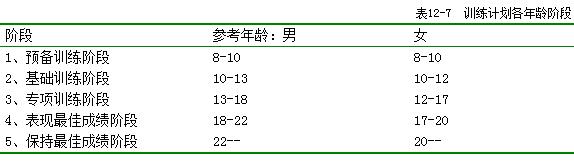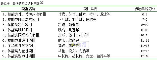 从项群的角度分析,初级选材和早期化训练的年龄,由小到大顺序如表12-6(按从上向下排列): 研究业已证明,技能类项群的许多专项性运动能力,如灵敏、柔韧、协调、速度等的发展敏感期均出现在儿童期和少年期;近来有学者研究表明,动作技术教学的敏感优效期也是在童年期,所以此类项目可以较早进行专项训练。但相当一部分人认为早期专项训练必然会拔苗助长,导致优秀苗子夭折,这其实是个误区;专项化训练不同于专业化训练,过早大负荷量的专业化训练是有弊端,但合理的专项技术学习是很有利的。乌克兰功勋体操教练员巴隆在我国执教时说:“必须在14岁以前把难度搞上去,否则对以后动作的发展会带来很多困难”。可见早期化训练在某些项群是可行的,也是必要的,关键是如何把握住尺度。 以体操为例,国家体育总局设置的全国少儿体操比赛,其年龄规定为:甲组11-12岁,乙组9-10岁,对难度有一定的要求,如果按照一些专家“技能类项目应在8-10岁开始早期专项训练”的意见,是难以完成难度的,因此有必要在7-8岁甚至更早点进行选材、训练。 跨栏的专项技术始训年龄也较早,9-11岁开始专门性练习及全面素质训练,11-12岁应基本掌握完整跨栏技术。 德国运动学家马伊纳尔认为,大脑皮层的神经细胞在9-12岁这个年龄段发育最快,这个阶段是运动技术发展的最佳时期。在法国运动队,常可见到10-13岁儿童,背越式跳高技术掌握得正确、优美。 关于篮球专项技术的敏感期,一般从14岁开始,系统训练4-5年;该敏感期可细划为3个阶段:1、技术掌握与提高快增期(形成动力定型);2、技术掌握运用的飞跃期(自动化);3、技术应用突破期(形成个人风格),依次相差约1-1.5 岁。 女子排球的专项训练,13-15岁为专项基础阶段,16、17岁进入成熟期,可承受大运动量训练时期。17、18、19岁进入青年组,进入各专位的全面技术时期。
