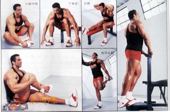 1)四头肌:站立,手握住某一物体保持平衡,将一腿向后弯屈,使脚后跟靠近臀部。呼气。继续将脚后跟向上掰。这条大腿应该和另一条大腿保持平行。 2)月国绳肌:坐在一条长凳上,将一腿伸直放在凳上,另一脚放在地上,将双手放在脑后,呼气,同时保持背部挺直,髋关节弯屈,使身体靠近大腿。 3)臀部:坐在地面上,背部靠墙。双腿伸直在身体前方。将一条腿向内收。用同侧的手握住膝关节。用对侧的手握住踝关节。将踝关节向内掰,使膝关节靠近对侧的肩关节。 4)下背部:坐在一张椅子上,将双腿略分开,屈髋关节,让腹部下降至双腿之间。如果必要收缩你的腹肌以放松你的背部肌肉。 5)大腿内侧:靠墙坐在地面上,双腿弯屈,两脚相互接触。放在身体前面。将你的双腿尽可能地拉向你的腹股沟。保持背部挺直。呼气。身体从髋关节处向前弯屈。