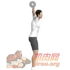双手将杠铃举起。腰部挺直,膝盖稍微弯曲。