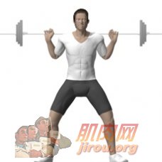 杠铃放在肩背。腰部挺直,双腿宽于肩距。。