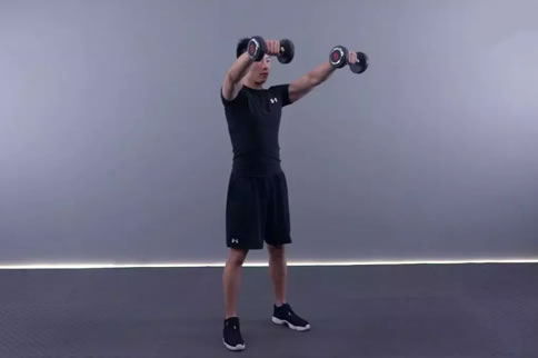 在锻炼的时候我们双手各握一只哑铃,然后进行前平举。在锻炼的时候你可以双手同时进行,也可以一只手锻炼完后再到另一只手。主要的是要保持锻炼的准确,锻炼的时候肩部不要耸肩,眼睛目视前方,注意力集中在你的三角肌前束。动作举起到稍微的超过肩部是最好的,这样可以让你的前束刺激更深入,锻炼的效果会更好。
