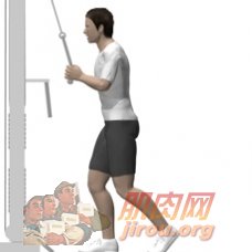 站在器械前,双手并排抓住缆绳附件。保持在垂直位置,也就是像一个锤头一样的姿势。掌心相对。