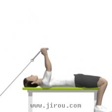 仰卧躺在平凳上,双手握住拉力器手臂。肘部保持微微弯曲。。