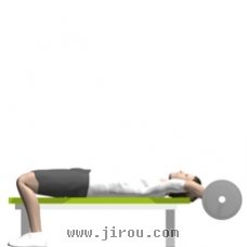 仰卧躺在平凳上,双手握住曲杆杠铃手臂。肘部保持微微弯曲。。