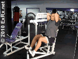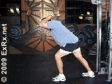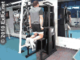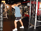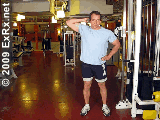 4.高力点绳把的拉力器颈后臂屈伸: 高力点绳把拉力器颈后臂屈伸对肱三头肌的锻炼介于正、反握拉力臂屈伸之间,侧重肱三头肌长头的锻炼。 调整好站距,背向器械,微屈膝、髋、挺胸、收腹、紧腰、躯干稍前倾,稳固地站立。双臂上举并尽量使双上臂靠近双耳,屈肘,肘尖垂直上指。前臂后举双手握拉力绳把并与绳把在一条斜线上,保持该动作姿态,拉起配重盘,使肱三头肌受力而被拉伸,此为准备姿势。尔后,肱三头肌发力,边牵引前臂伸肘,边向下拉压上臂,至上臂与肩同高并平行于地面时,前臂基本伸直或接近伸直,在此基础上,再以意念彻底收紧肱三头肌,保持这种“顶峰收缩”状态约1秒钟,再协调地。退让性地还原上臂与前臂于起始位置。周而复始。在起始位置上必须保证肱三头肌的受力状态。用力移臂呼气,还原举臂时吸气。若力点高度不够,也可将拉力线置于肩侧,但实际练习时应均衡两臂受力程度。