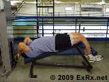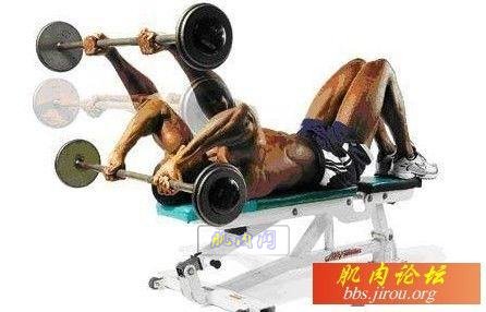 2.动作开始吸气,保持上臂不动,依靠肘关节弯曲,来使前臂慢慢的向头部上方部位下落,一直落到离额头大约两公分距离的时候,靠肱三头肌发力将小臂挺直,同时呼气,手臂再次的还原到起始垂直于身体的状态,然后稍停顿一秒钟再次进行下一个动作。如此反复。 下面是注意事项与其它的一些训练动作: 1.如果肘关节力量薄弱,可以不将手臂完全伸直,以避免受伤。 2.大重量练习挺直手臂时,应尽量用意识克制使身体不离开平登。 3.接近力竭的时候,垂直的大臂可以稍稍向头的方向倾斜,借一点上胸的力量再做几次,可以让肱三头肌得到更多的刺激。 4.双臂起落时双肘的距离要保持不变,保证刺激的是肱三头肌中部的位置。 5.几种卧式臂屈伸对比:杠铃和哑铃的平躺、上斜、下斜,各三种臂屈伸