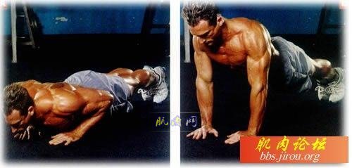 下面是注意事项与一些难度较小的训练方法: 1.注意握距不同对于目标肌肉的区别:窄握距的俯卧撑,两肘内收紧靠体侧对发展肱三肌的力量有利;宽握距俯卧撑,两肘稍外展对发展胸大肌的前锯肌的力量有利。两者对发展肱三头肌、胸大肌前锯肌的力量都相互兼顾,主要是主、次不同而已。 2.各种形式比较: 无负重形式的 负重形式