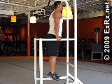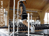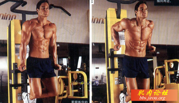 1.双手窄握撑杠,然后让肘部完全的伸直,将整个身体上升至最高点,双眼目视前方前方、要始终的保持双胳膊的肘关节是指向后方。 2.吸气,屏住呼吸缓缓的把身体下放,一直直至到上臂与地面平行为止。不能让身体的胸部和肩部有很明显的牵拉感,要一直将重点保持在肱三头肌上。 3.收缩肱三头肌,瞬间快速的将肘关节伸直,将身体垂直由下往上推,一直恢复到肘关节完全伸直状态。 4.稍停顿2~3秒,重复。 下面是注意事项与其它的适合女性或初级训练的男性的训练动作: 1. 关键要区分锻炼胸大肌、肱三头肌的双杠臂屈伸: 2.若每组可做15次,需要在腰部负重(或腿夹哑铃负重),再进行练习,才会有可能再次提高;