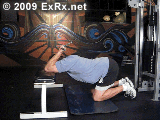 3.跪式拉力器臂屈伸: 使用高位拉力器并选用合适的重量,抓住拉力器绳索的末端,背向器械跪在地板上。身体稍向前倾斜,向前伸直双臂。动作过程保持上臂不动,弯屈肘部下放重量。然后再伸直双臂,将重量推起,锁定肘部,竭力使肱三头肌达到最大限度的收缩。肱三头肌充分地收缩和伸屈,使其受到持续不断的张力。