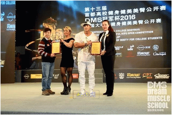(DMS国际体育董事长王萱、北京市大学生健美协会常务秘书长张育王为赞助商颁奖) 2016年11月6日,DMS国际体育主办的“DMS冠军杯”第十三届首都高校健身健美美臀暨全国大学生健身健美美臀邀请赛,在北京联合大学体育馆隆重举行,300多位高校大学生参加了此次赛事,国际健身巨星黄哲勋及金妍儿团队作为DMS国际梦肌肉学院名誉导师现场表演,无论规模和影响力,均堪称历史之最。